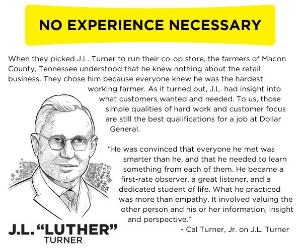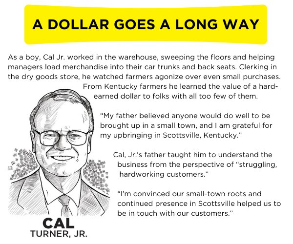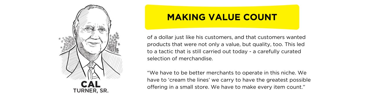 After his father died unexpectedly, J.L. Turner quit school in the fourth grade to help his family. From then on, he assumed everyone else knew more and he became a keen student of other people. Cal Sr. once said he and his dad never had an original retailing idea. They just worked hard to make sure that others’ good ideas were effectively put into practice.