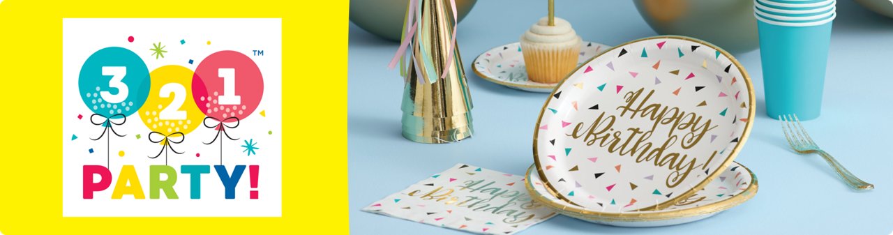 321 Party! includes a comprehensive selection of birthday party supplies, such as banners, tableware, and decorations.