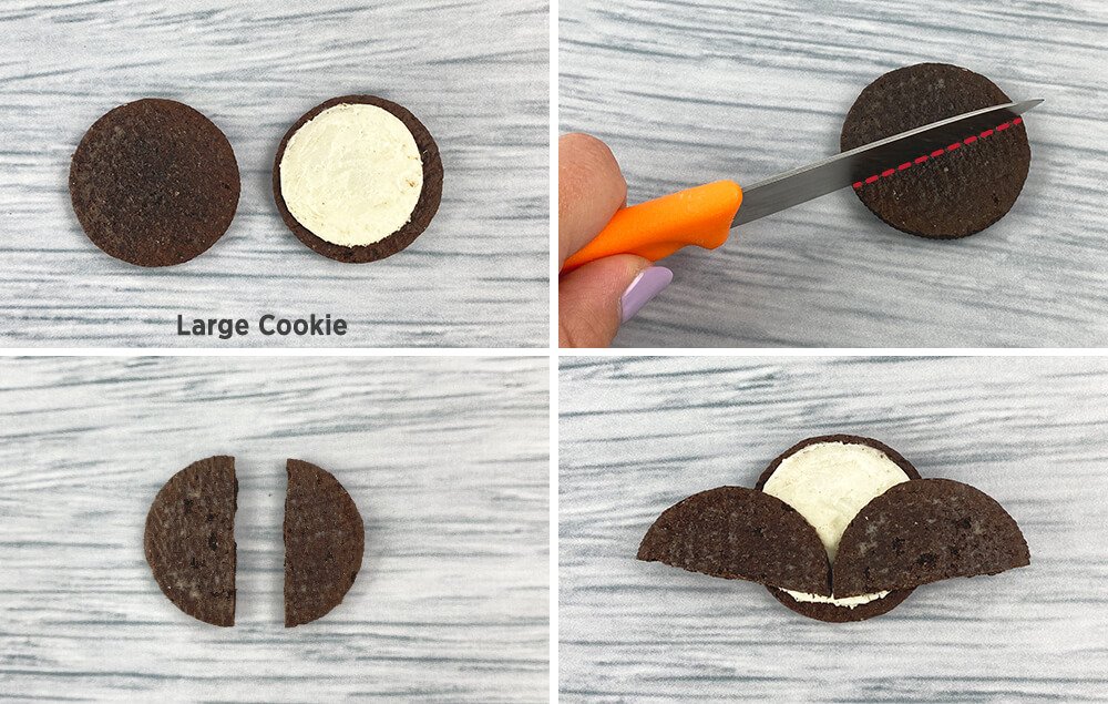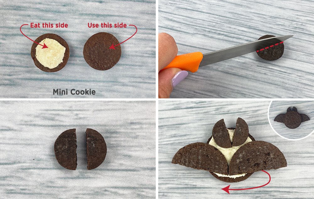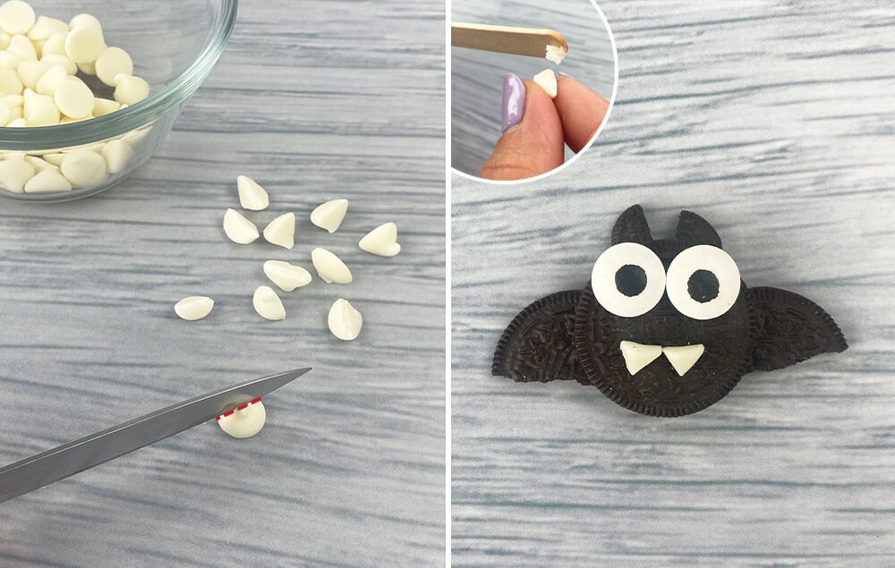 A) Cut a white chocolate chip in half to create bat teeth.