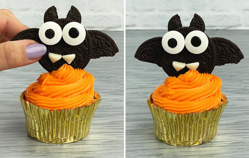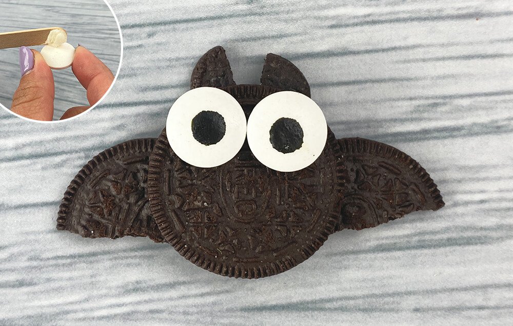 A) Place a small amount of icing onto the backs of two large candy eyes and press them onto the bat body.