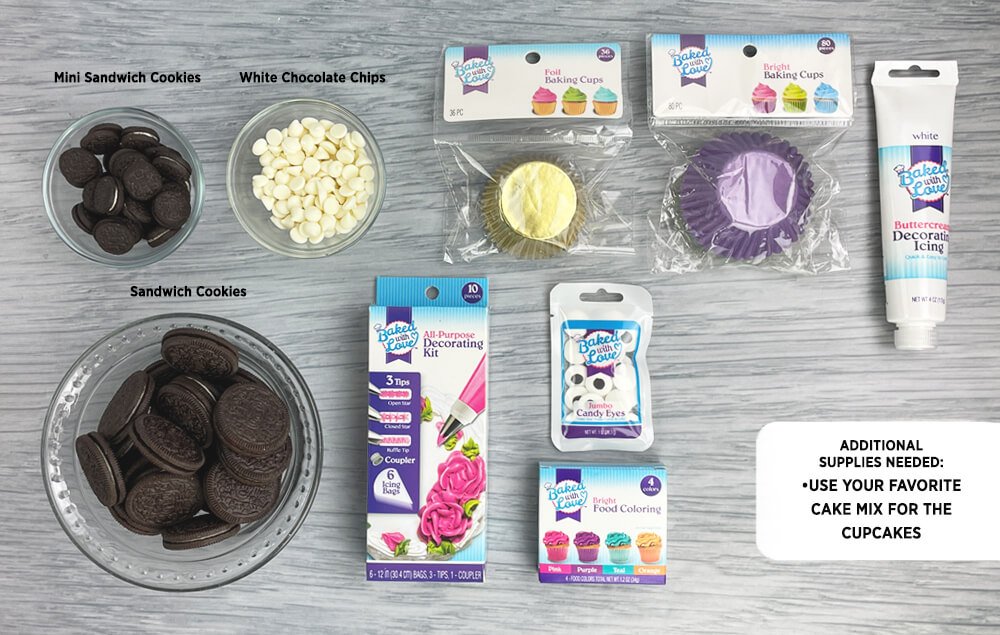 D) Use piping bags to add icing to the cupcakes. Note: Directions on how to assemble and fill the bags are included in the kit.