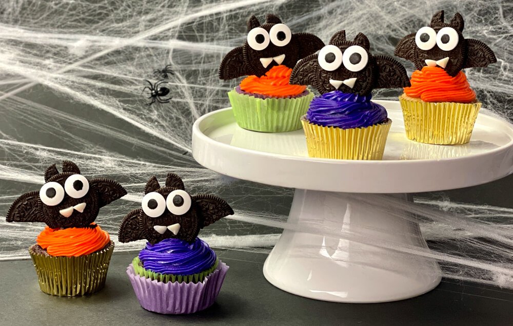 These Halloween treats feature colorful cupcakes topped with spooky edible bats. Use store-bought cake mix to make this a frighteningly easy dessert!