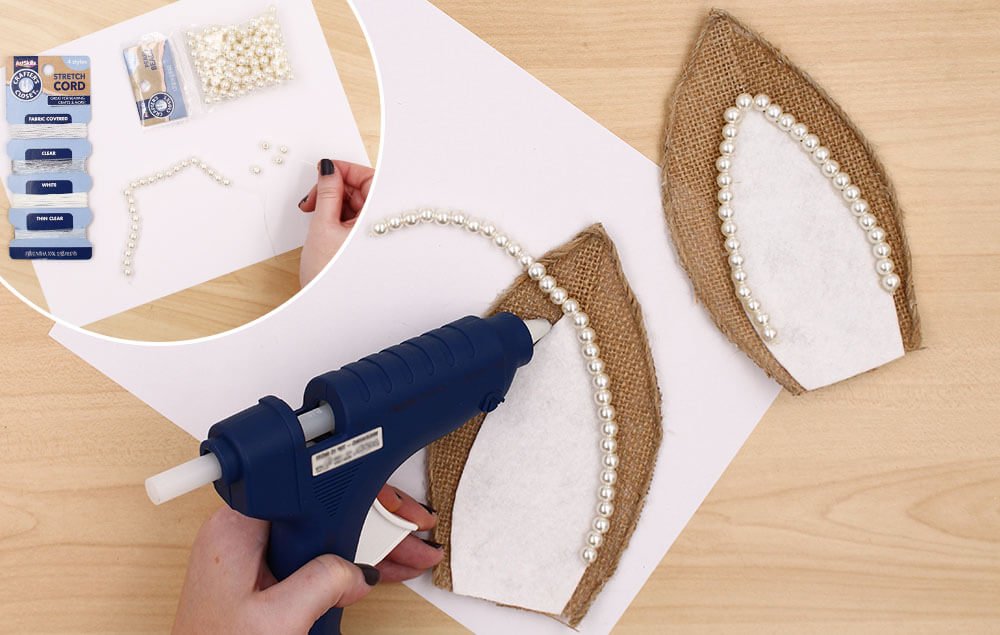 If using Crafter's Closet Pearl Beads, string 29 beads onto Thin Clear Stretch Cord and tie off the ends (see inset photo). Hot glue the string of beads on to the ear along the edge of the white felt. Make sure the center bead on the string is at the top point of the white inner ear piece and then glue down the sides (Note: The beads will not reach the bottom of the ear). Repeat process for the other ear.