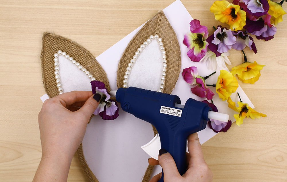 Adhere both ears to the underside of the headband using hot glue and making sure they are evenly spaced from the center.