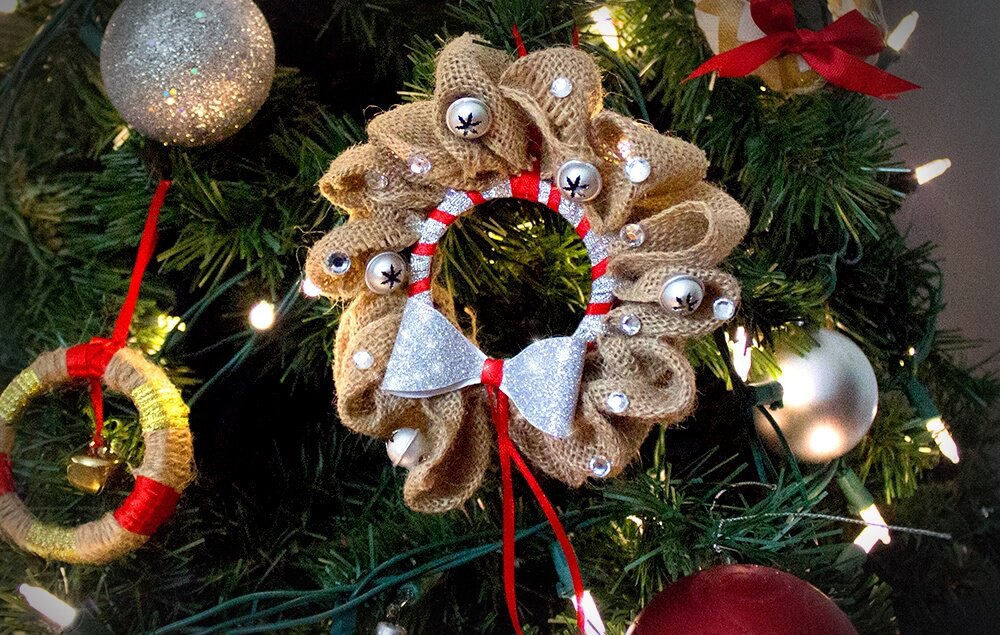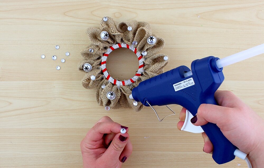 Glue jingle bells and gems to the burlap wreath.