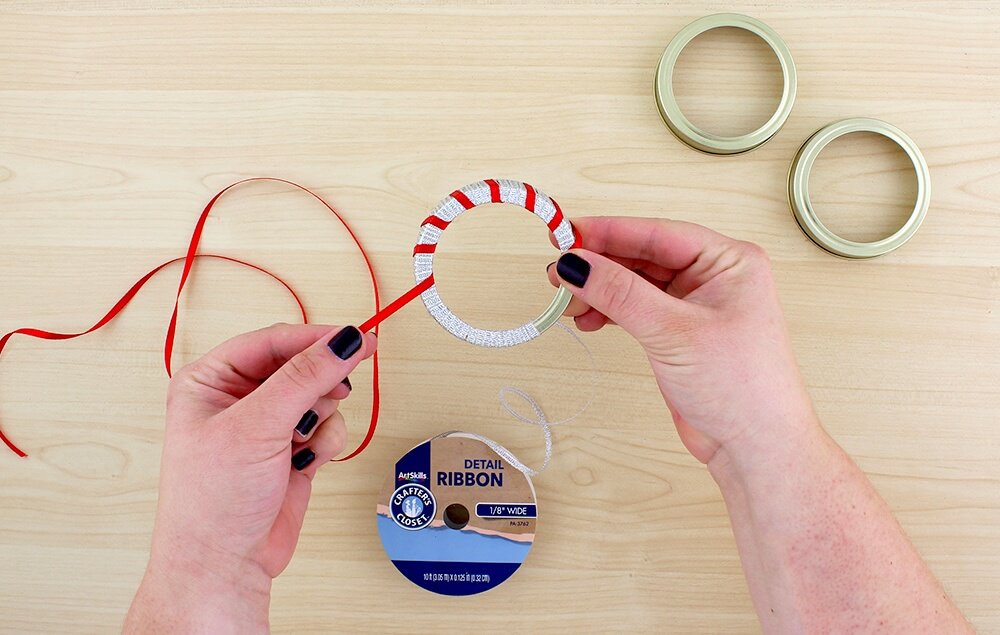 Remove the outer ring from a mason jar lip and wrap it with silver ribbon. Next, wrap the ring with red ribbon to create a candy cane pattern.