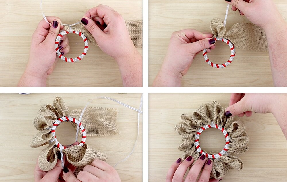 Attach burlap to the ring using silver detail ribbon. Form a loop and secure the looped section to the ring. Continue creating loops until you have completed the ring. Fluff each loop to give the wreath a fuller look.