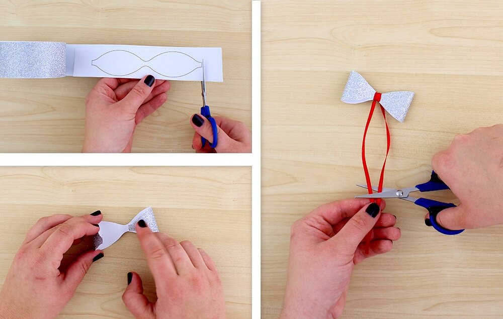 To create a bow using silver glitter duct tape, start by downloading and cutting out the free template. Trace the template on the back of the tape and cut it out. Fold the ends of the tape into the middle, secure with glue and wrap red detail ribbon around the center to complete. Trim the red ribbon and attach the bow to the wreath with hot glue.
