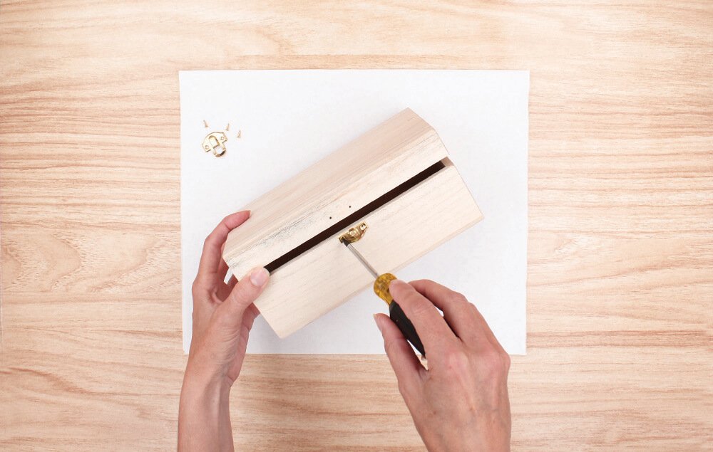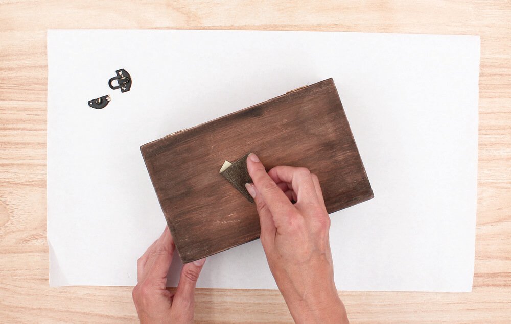 Use sandpaper to distress the box and metal clasp. Rub the sandpaper to lightly remove some of the paint.