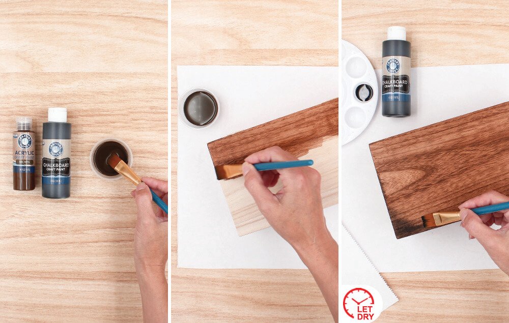 Mix a large dollop of brown paint with a small amount of black chalkboard paint and 2 tablespoons of water to make a thin stain.