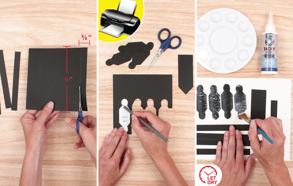 Cut a black cardstock square into six ⅝" x 6" strips.