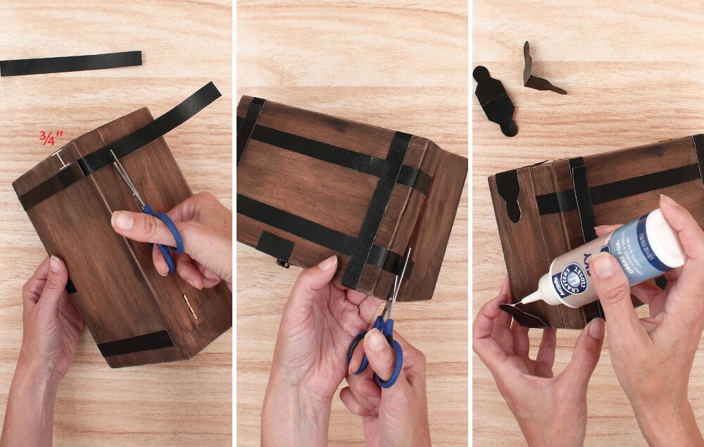 Glue the black-painted pearls onto the straps and brackets. Evenly space the pearls on the lid straps and place a pearl on the rounded area of each buckle.