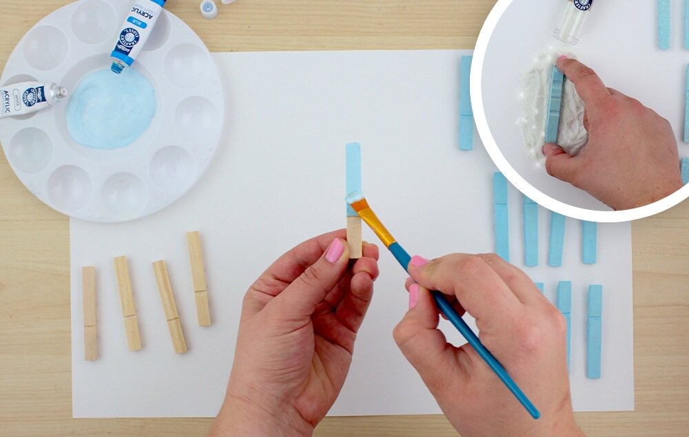 Mix white paint with a small amount of blue paint to create a very light blue color. Remove the metal clasp from nine clothespins and paint each of the clothespin pieces (18 total) with two coats of paint. Let dry completely.