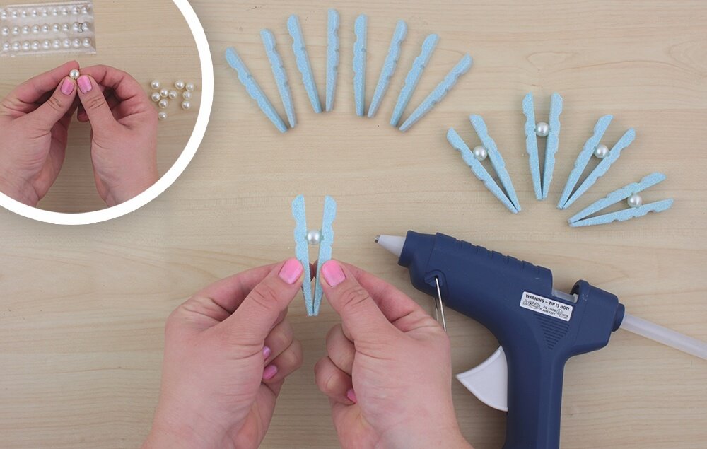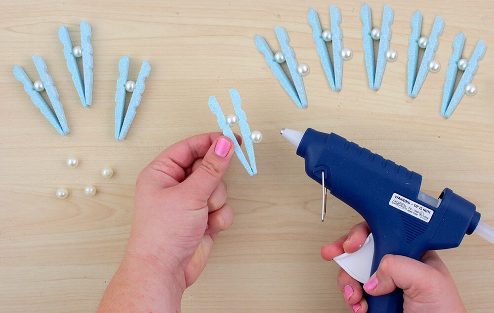 On the right side of each clothespin pair, glue a pearl ball to the lower clothespin notch.