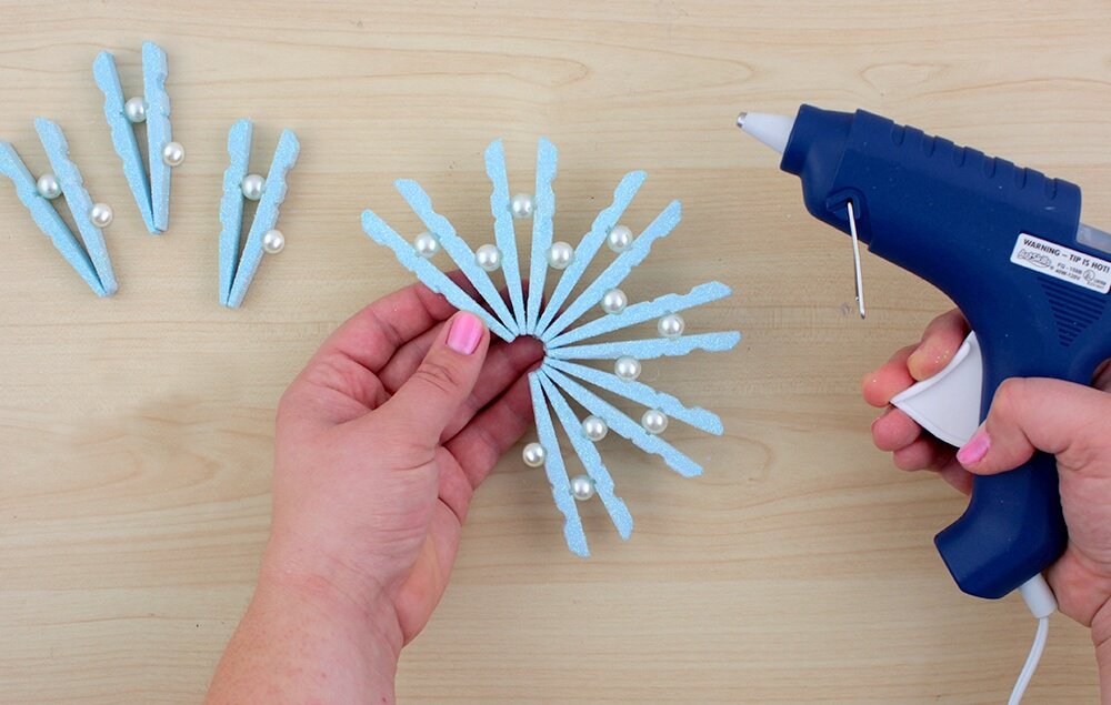 Align the nine pairs of clothespin pieces back to back. Create pearl balls by attaching two pearl gems back to back. Glue a pearl ball in between the small notches of each clothespin pair.