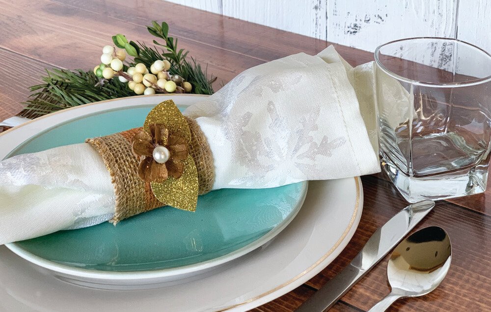 Impress your dinner guests with gorgeous, handmade napkin rings at each place setting. Pretty pinecone flowers adorn rustic burlap rings, perfect for fall décor!