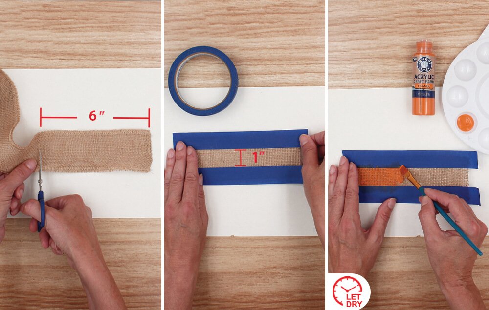 Paint the exposed burlap strip orange. Let dry. Peel off the painter’s tape.