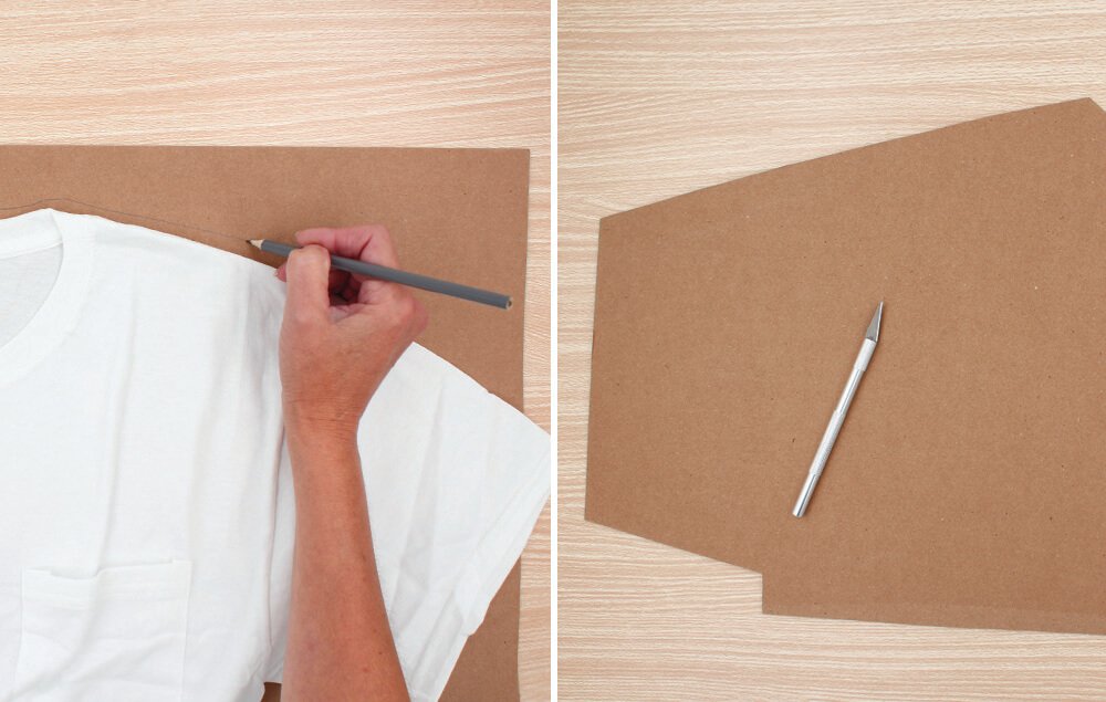 Lay a T-shirt onto cardboard or newspaper and trace along the top and arms of the T-shirt.