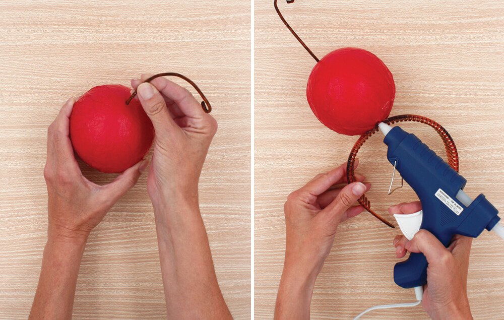 Using a paint brush, apply a coating of tacky glue over the red foam ball and let dry. This will create a sheen on the cherry.
