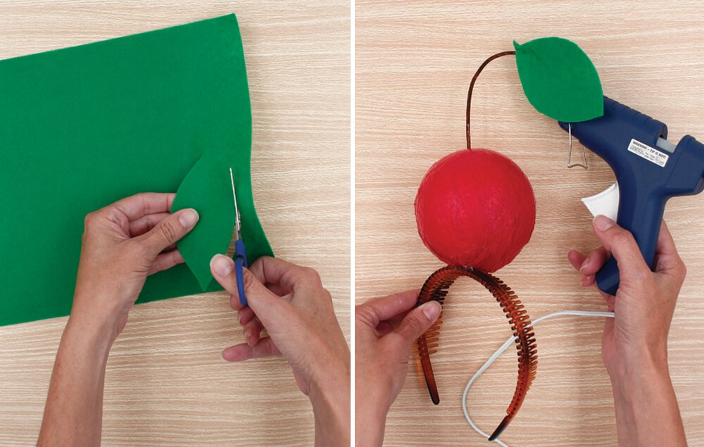 Hot glue the leaf onto the tip of the curved end of the cherry stem.