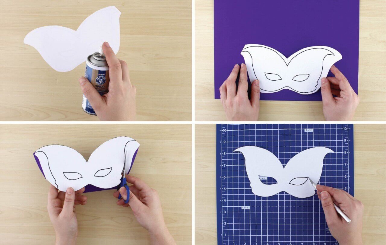 Download and print mask template. Cut out around the mask shape, leaving the other shapes for the following steps. Flip over mask and apply Spray Adhesive to the back.