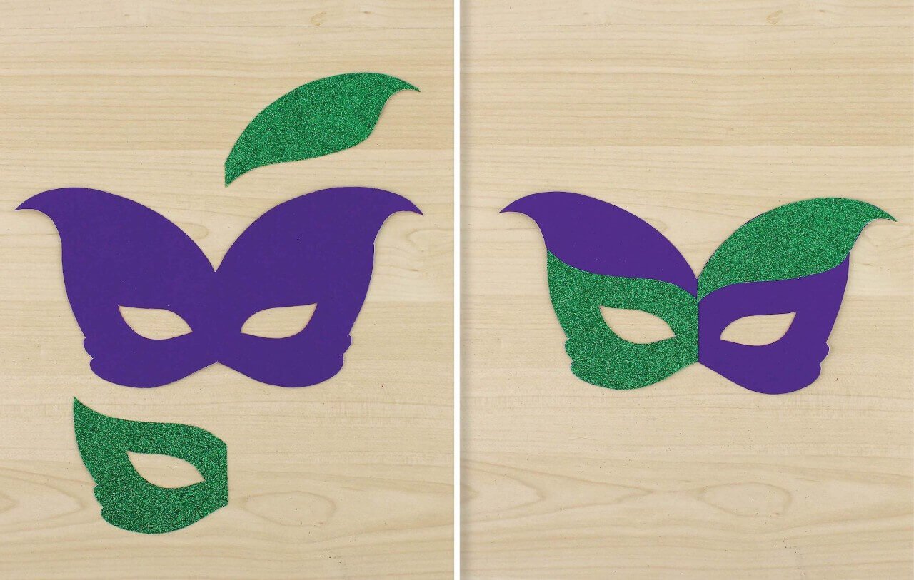 Using Spray Adhesive, mount the green glitter shapes to the appropriate sides of the purple mask.