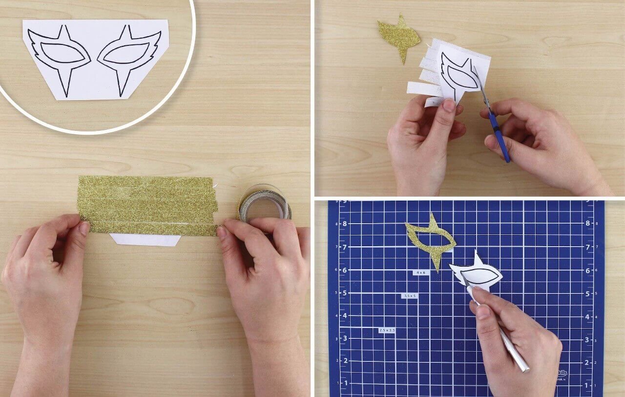 Taking the two eye shapes from the download, flip over and cover the back with the gold Detail Glitter Tape.