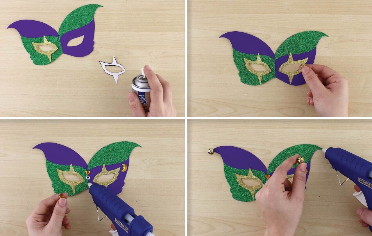 Hot glue gold jingle bells to the points of the upper mask.