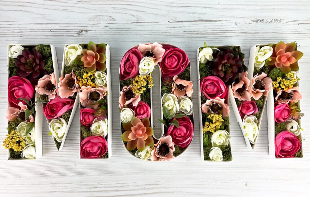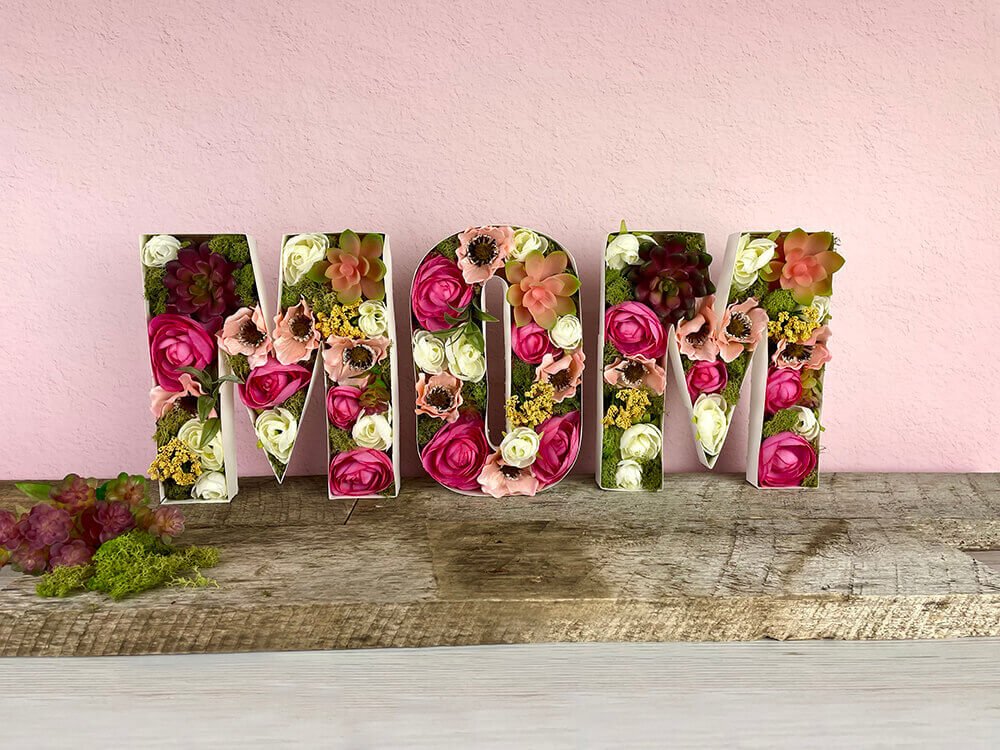 Celebrate Mom with this beautiful floral centerpiece! These flower letters are a great Mother’s Day decoration idea — they're easy to create and bursting with spring blooms. Plus, the artificial flowers will always stay picture-perfect!