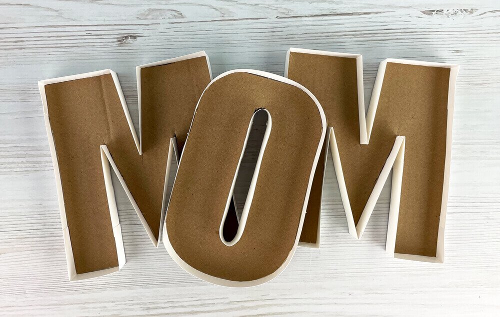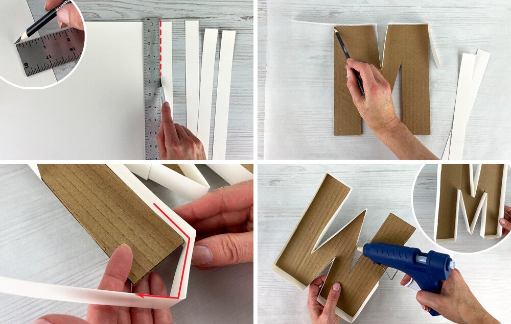 D) Once the strips are bent to fit, hot glue them in place around the letter.