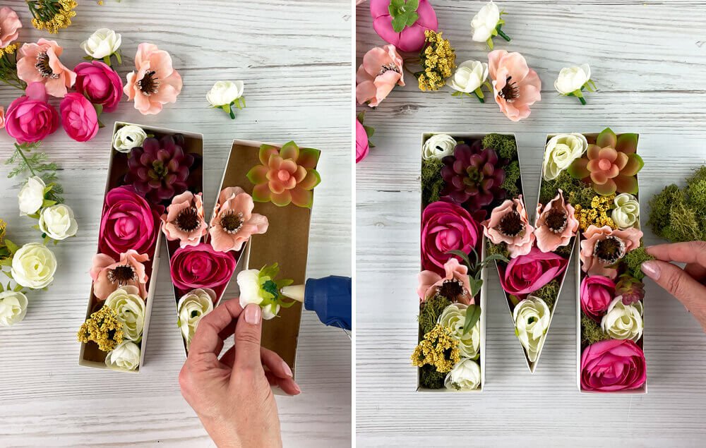 A) Fill a letter with artificial flowers. Hot glue the flowers in place.