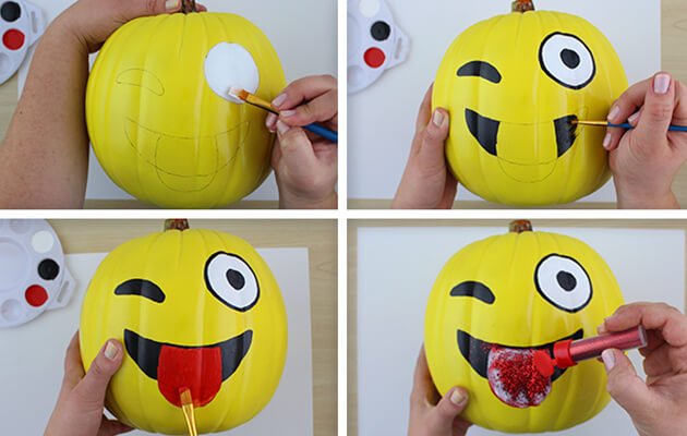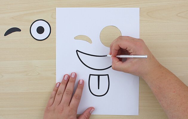 Once all paint is dry, paint over tongue with glue and sprinkle glitter on top. Shake off excess glitter and let dry. Repeat the process to create additional emoji faces.