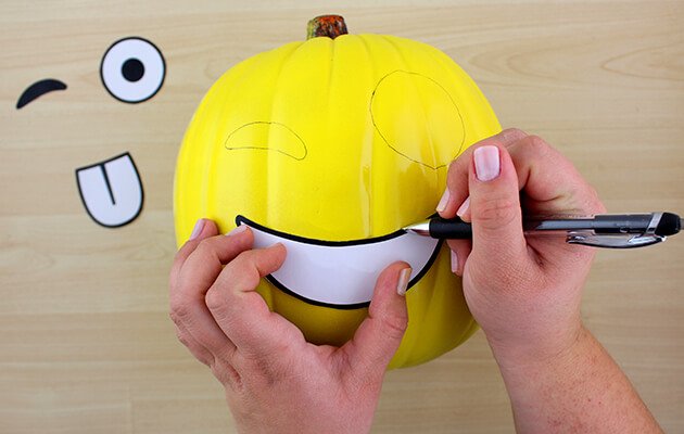 Paint the outlined features using the acrylic paint, brushes and paint palette. Paint the open eye white. Paint the outline and pupil of the open eye black, along with the winking eye and mouth. Be sure to avoid the tongue when painting the mouth black. Paint the tongue red. (Note: Let paint dry after each color is applied before adding the next color.)