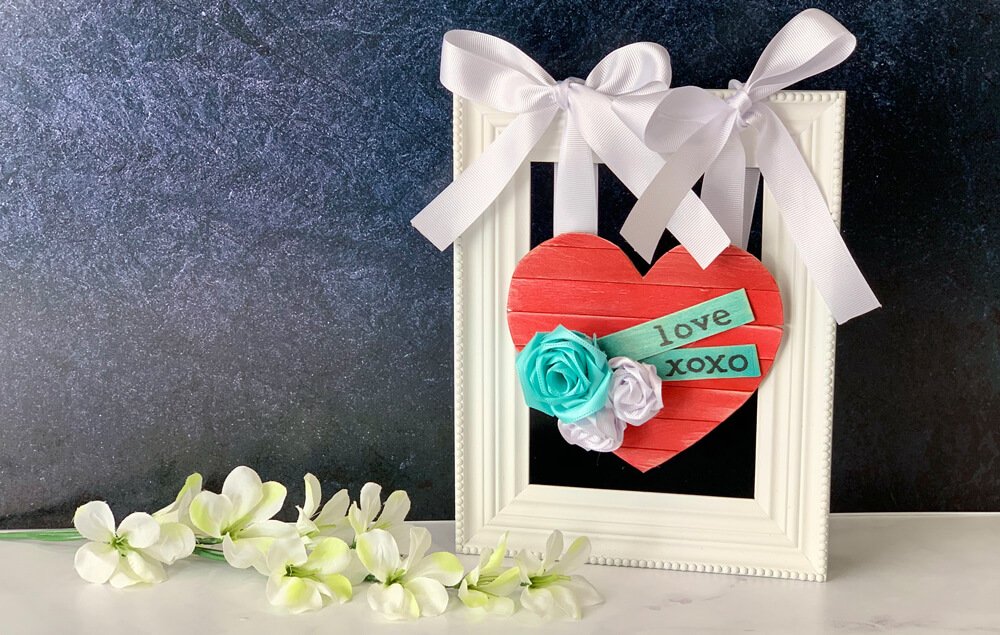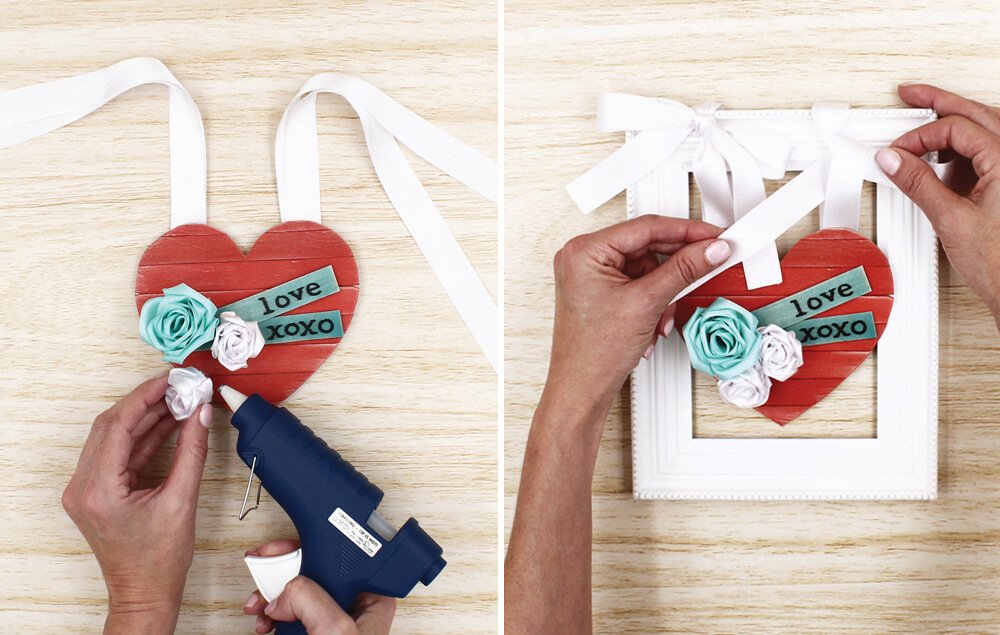 Loop the ribbon around the frame and tie the heart to the frame.