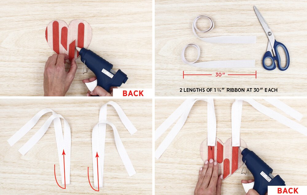Hot glue the folded ribbon to the back of the heart at the top.