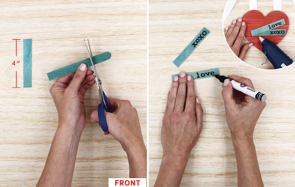 Write love sentiments onto the craft sticks with a black paint marker and then hot glue them onto the heart, as shown.