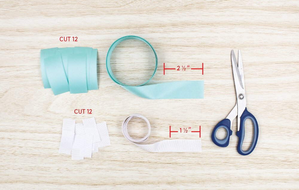 Cut twelve 1 ½" pieces of ¾" ribbon.