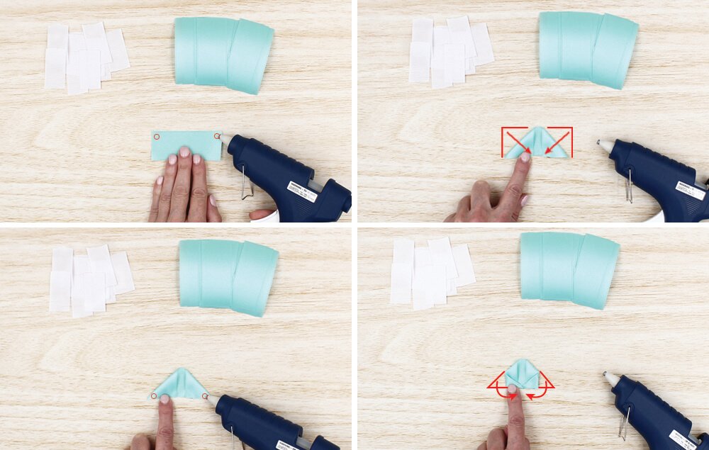 Add a dot of hot glue to the top corners of a ribbon piece.