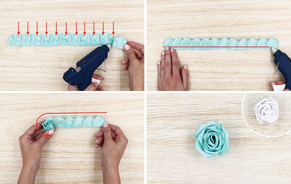 Note: Assembly is the same for BOTH ribbon widths. We made one large and two small roses for our finished piece.