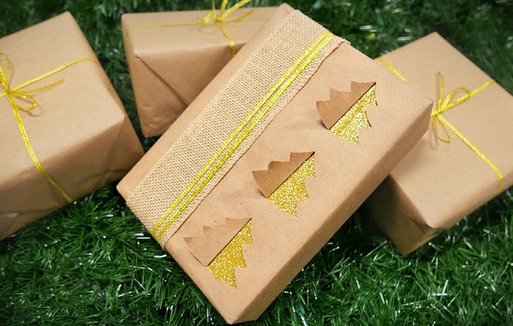 Fold out each cutout and press down to reveal each glittery tree along your wrapping.