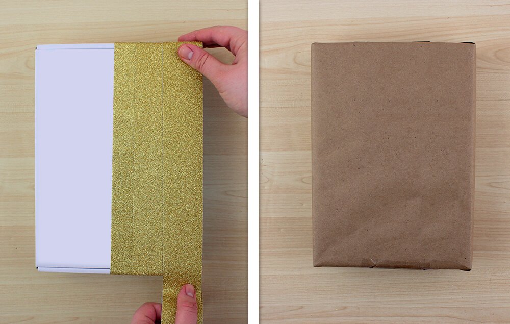 Tape the right half of your gift with gold glitter duct tape, then wrap your gift in craft paper. (Note: If you do not want to tape directly onto your gift, keep the backing on your duct tape and just secure the ends with a piece of clear tape. Mark your craft paper with a small pencil mark to make sure you know which side has the glitter paper underneath.)