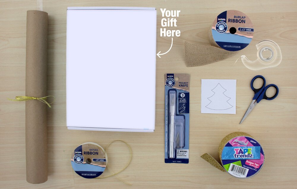 On the right side of your present, cut around just the right half of your tree template. Be careful so that you just cut the craft paper and do not cut into the glitter duct tape underneath. Repeat this for the desired number of trees. We cut out three tree shapes on our gift.