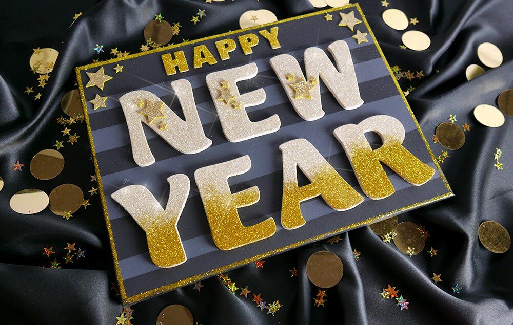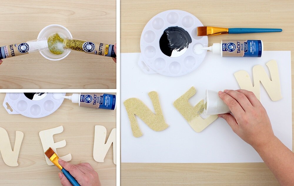 Mix 1-part gold and 2-parts iridescent glitter together in a cup. Paint the large letters “N-E-W” with tacky glue and cover with the glitter mixture (be sure to save some off the glitter for the next step).