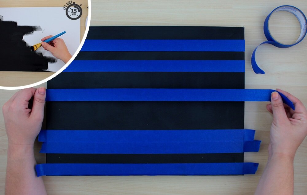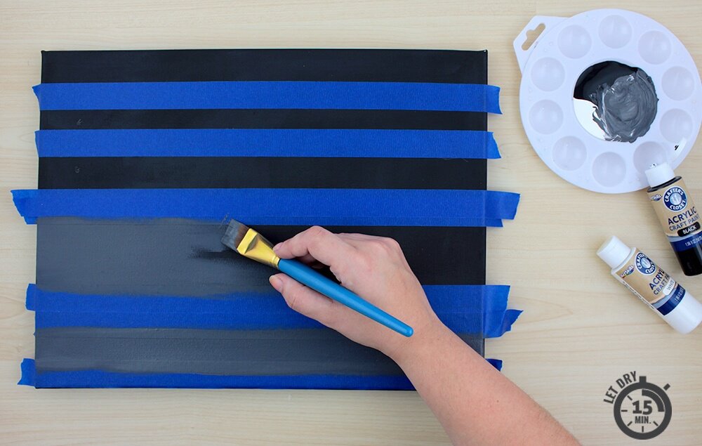 Mix equal parts of white and black acrylic paint to create a medium gray color. Paint between each strip of tape and let the paint dry completely. Once dry, remove the painter’s tape from the canvas.