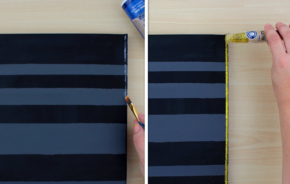Brush tacky glue along the edges of the canvas and cover with gold glitter. (TIP: You can use the painter's tape to help with a clean line.)