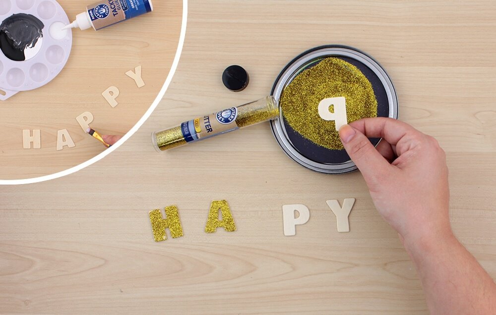 Find the small wooden letters to spell “H-A-P-P-Y”, brush with tacky glue, and dip each letter in gold glitter.