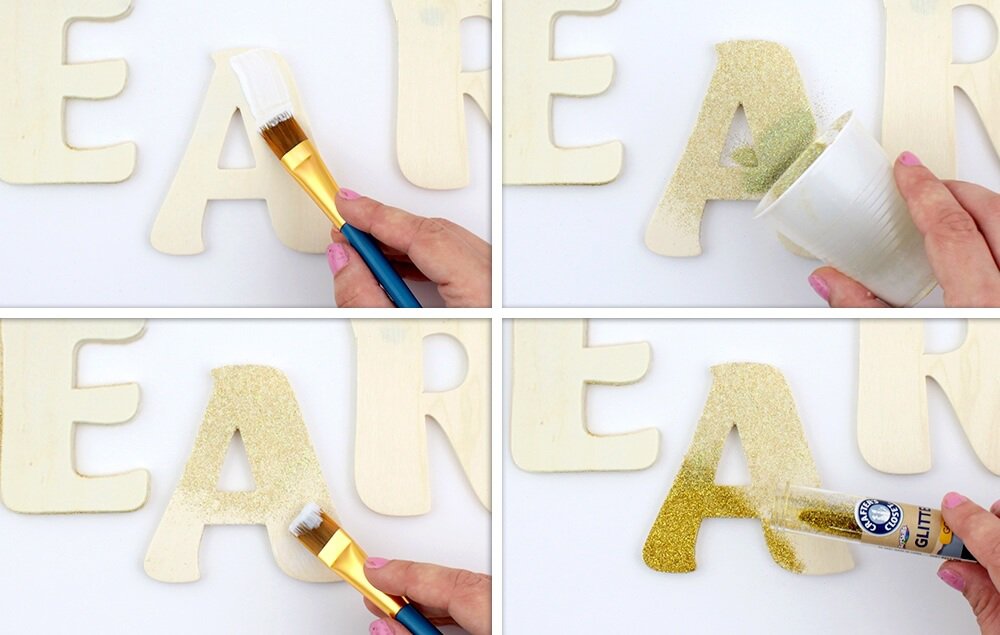 Ombre glitter the letters Y-E-A-R. First, apply glue to ¾ of the top portion of each letter and cover with the glitter mixture from step 5. Let dry. Next, brush tacky glue on the lower portion of each letter and slightly over the edge of the already glittered top portion of each letter. Then, cover the tacky glue with gold glitter starting lightly at the top and gradually getting thicker towards the bottom.