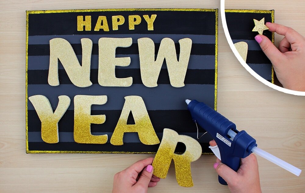 Position the words on the canvas then hot glue letters in place. Add gold glitter foam stars to the canvas and letters for some extra sparkle.
