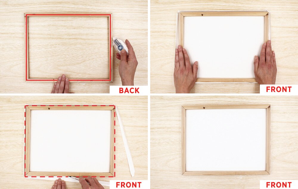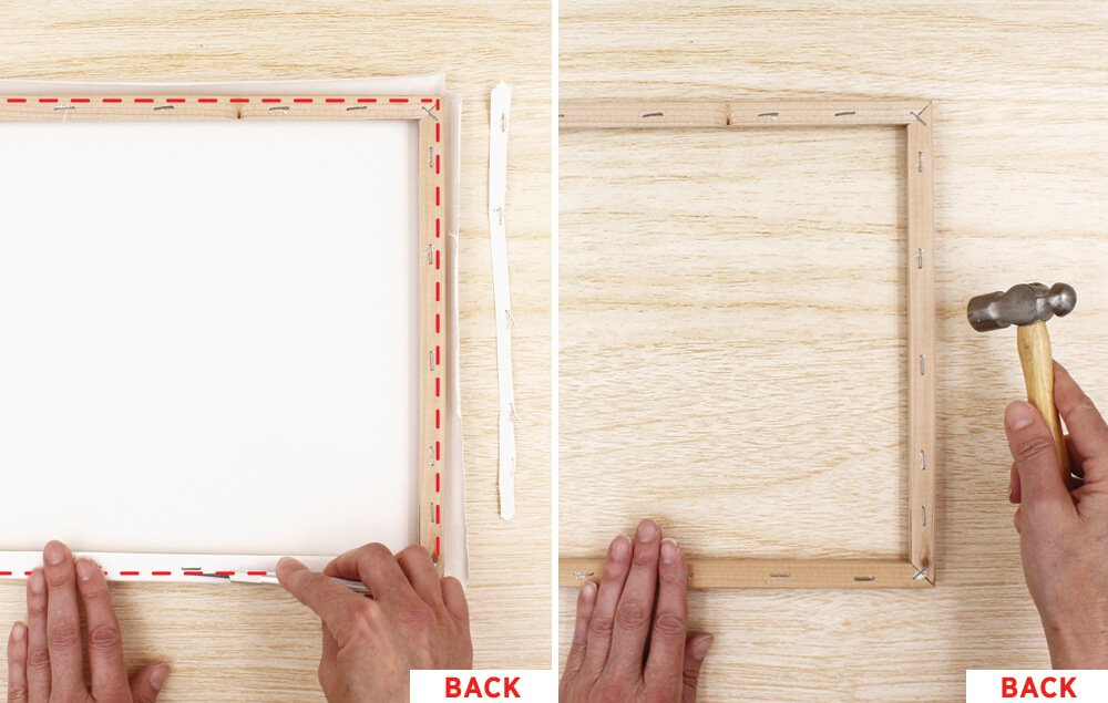 Use a hammer to flatten the staples so they are flush with the wood frame. This will be the back of the frame.
