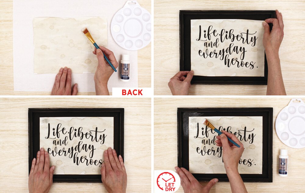 Apply a thin layer of deco podge over the whole front of the canvas and paper. Let dry.